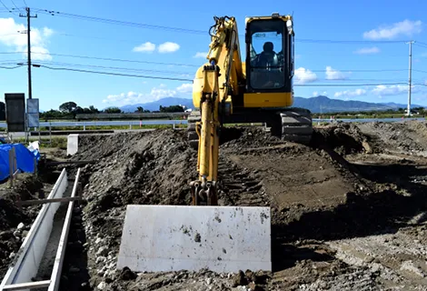公共工事では道路の改良や土地の造成、道路の舗装を行い、民間工事では宅地の整備、駐車場の舗装、住宅や施設の外構工事を行います。